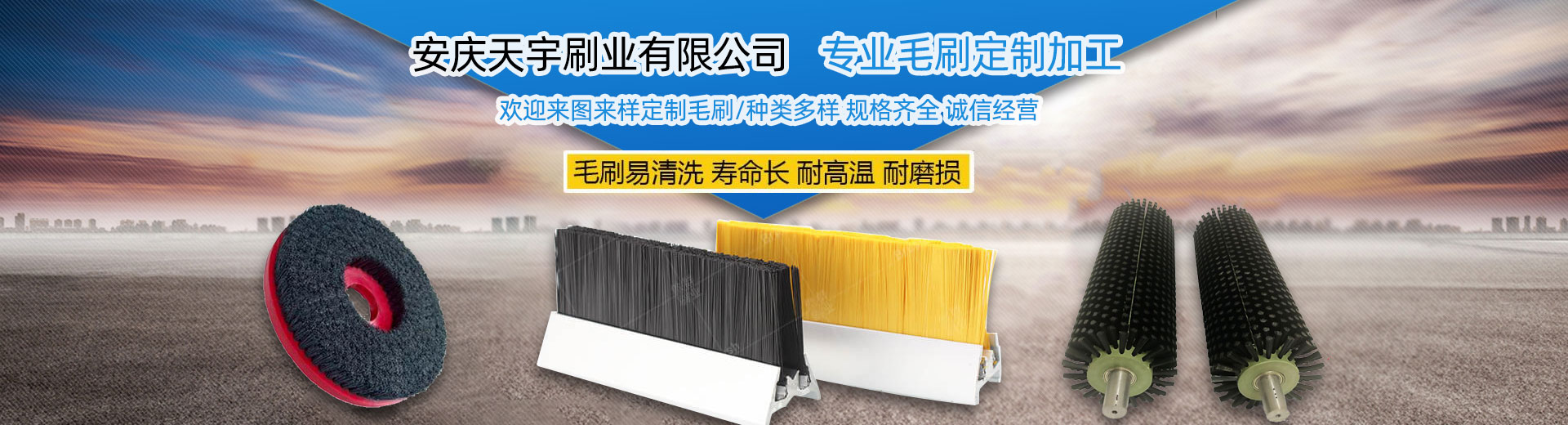 安慶天宇刷業有限公司位于擁有多年制刷歷史的安徽省潛山縣源潭鎮,現被評為“中國刷業之都 ”稱號,地處國家名勝風景區“天柱山”腳下,是黃梅戲之鄉,地理環境優越,交通運輸便捷。我廠是一家有著二十多年制刷經驗,在本地區較早從事毛刷生產的廠家之一,主要加工生產各種工業機械配套用的毛刷、毛刷輥、條刷、密封毛刷、機械刷輥、清洗刷輥、尼龍刷輥、鋼絲刷輥、鋼絲輥、海綿吸水輥,條形刷,圓盤刷,毛刷板,彈簧刷、內繞彈簧...